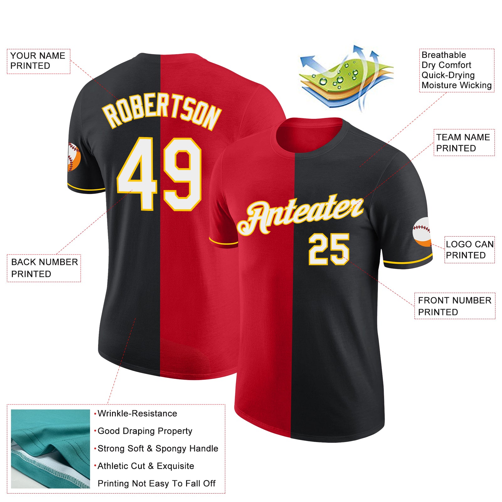 Custom Black Red-Yellow Split Fashion Performance T-Shirt