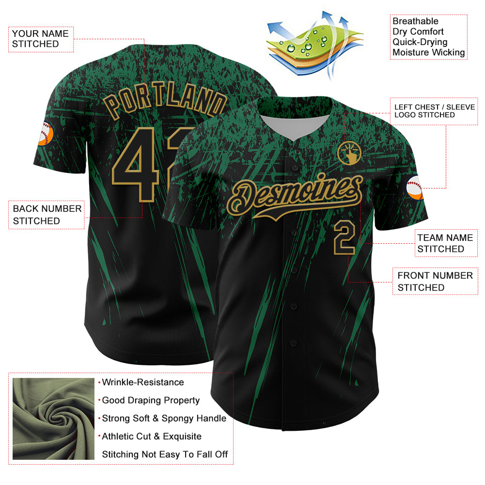 Custom Black Kelly Green-Old Gold Distressed Scratch Brush Stroke Authentic Baseball Jersey