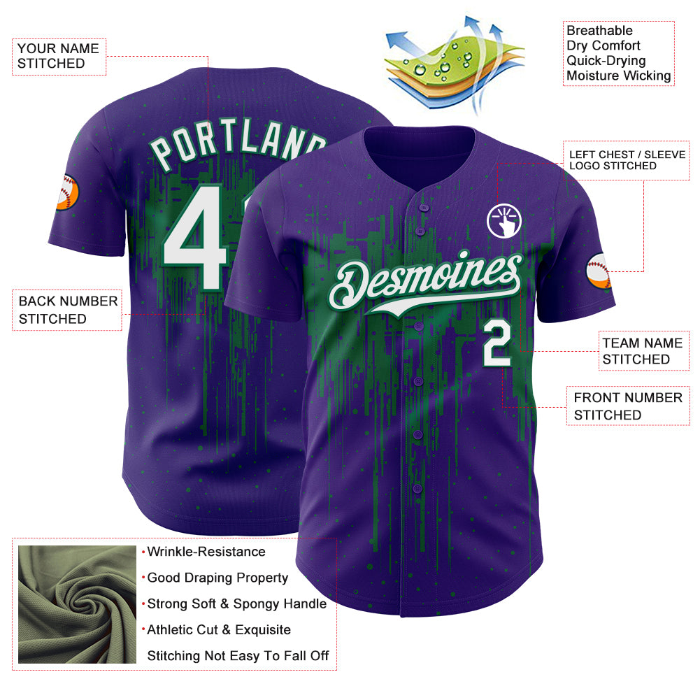 Custom Purple White-Kelly Green 3D Pattern Design Dripping Splatter Paint Authentic Baseball Jersey
