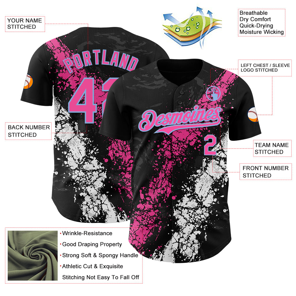 Custom Black Pink Light Blue-White 3D Pattern Design Splash Authentic Baseball Jersey