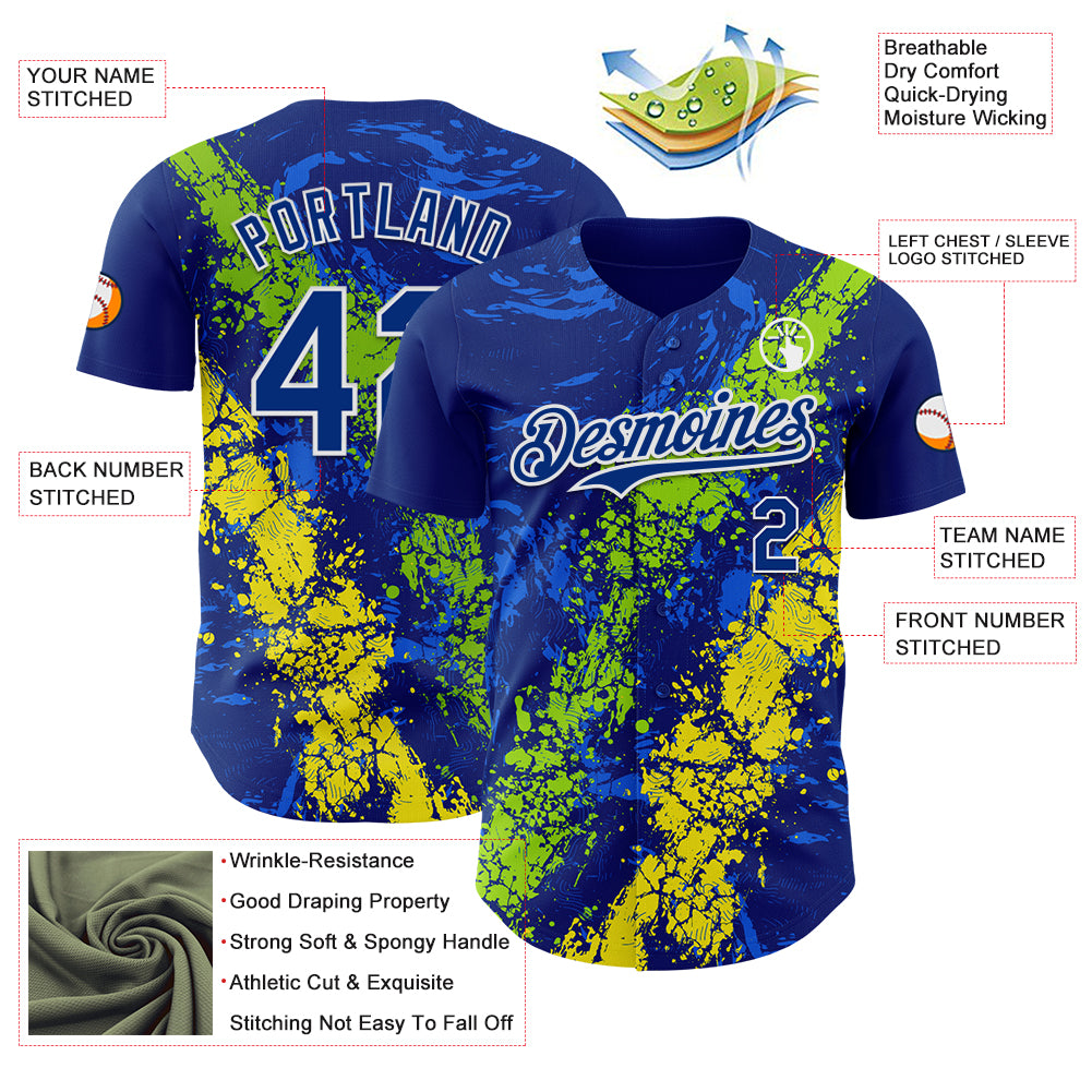 Custom Royal Neon Green Light Yellow-White 3D Pattern Design Splash Authentic Baseball Jersey