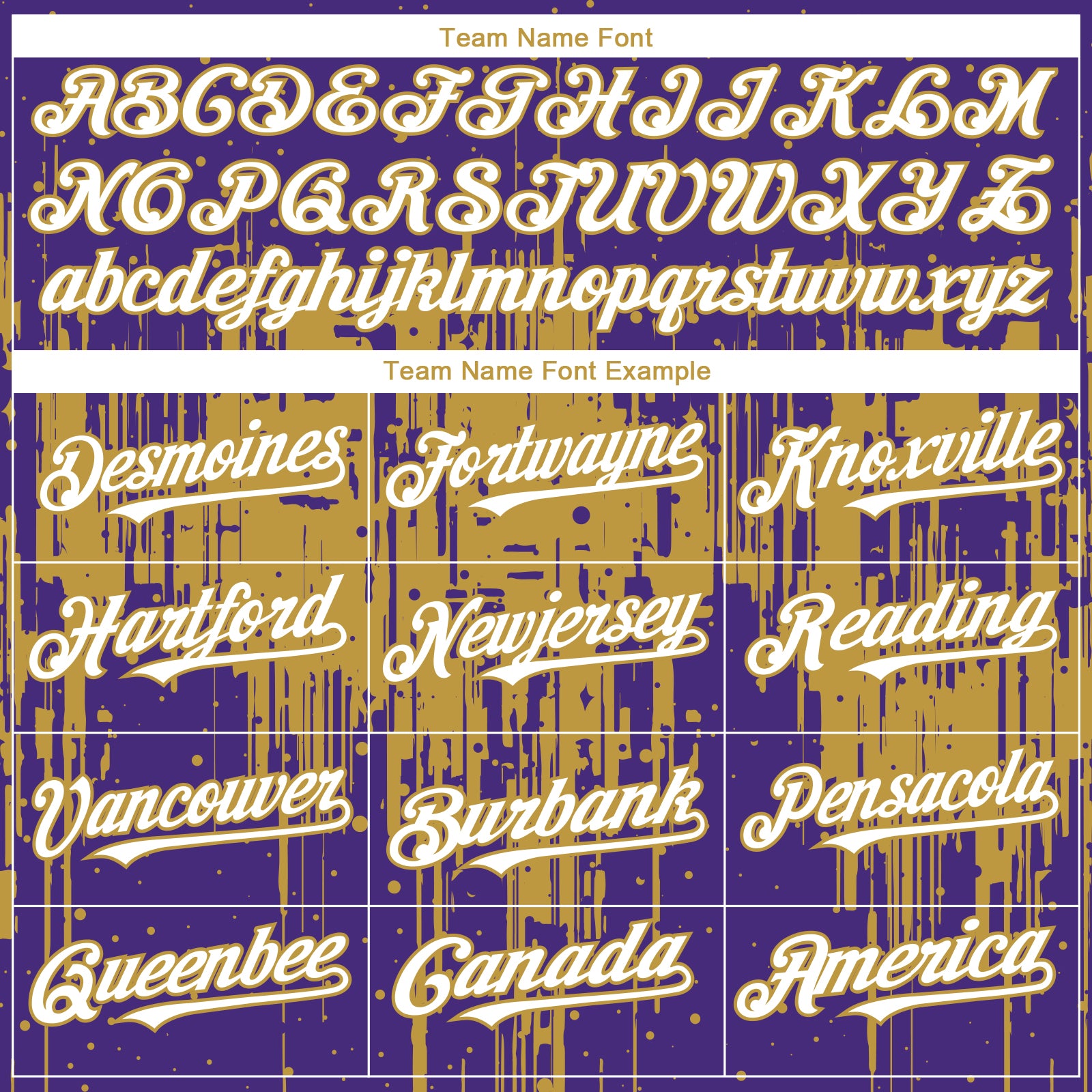 Custom Purple White-Old Gold 3D Pattern Design Dripping Splatter Paint Authentic Baseball Jersey