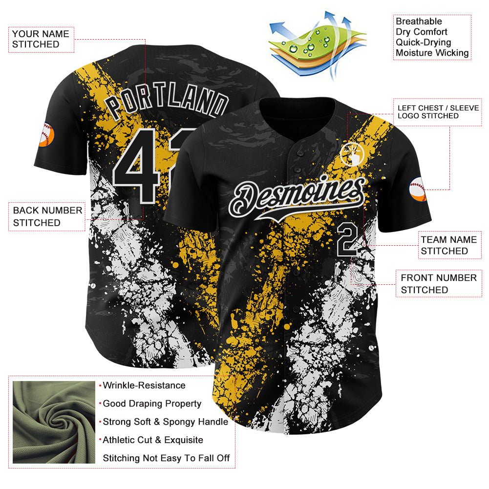 Custom Black Yellow-White 3D Pattern Design Splash Authentic Baseball Jersey