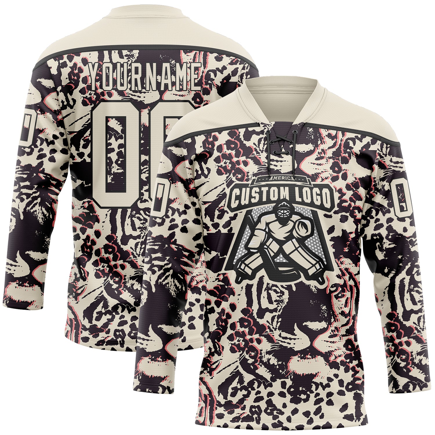 Custom Cream Black-Pink 3D Pattern Tiger Print Hockey Lace Neck Jersey