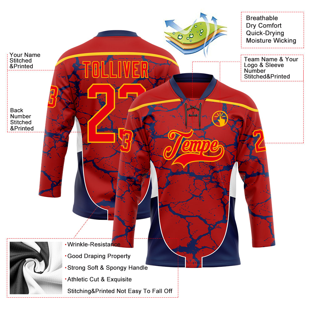 Custom Red Fire Red Gold Navy-White 3D Abstract Pattern Graphic Cyber Mecha E-sport Hockey Lace Neck Jersey