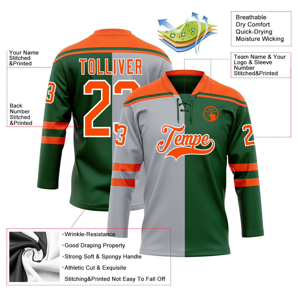 Custom Green Orange Gray-White Split Fashion Hockey Lace Neck Jersey