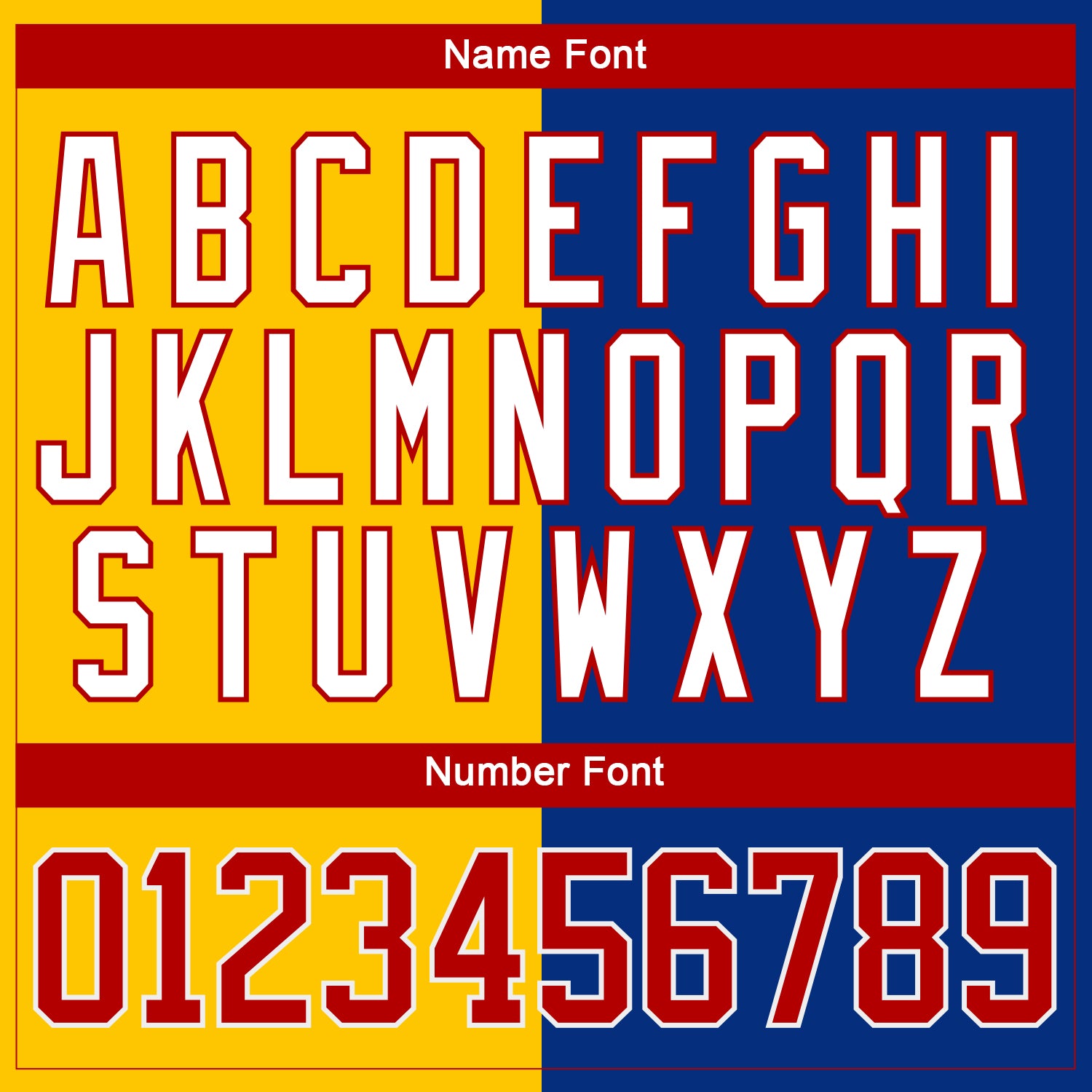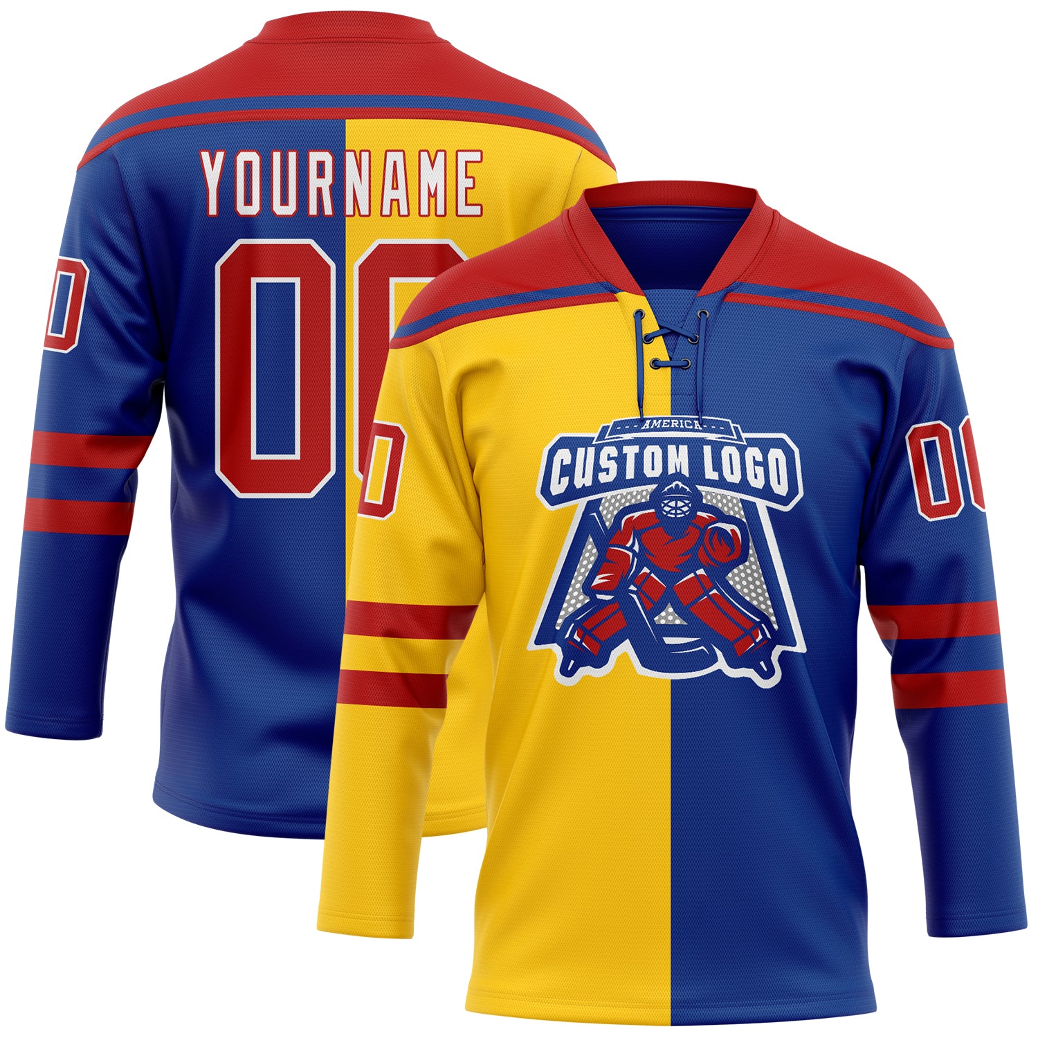 Custom Royal Red Yellow-White Split Fashion Hockey Lace Neck Jersey