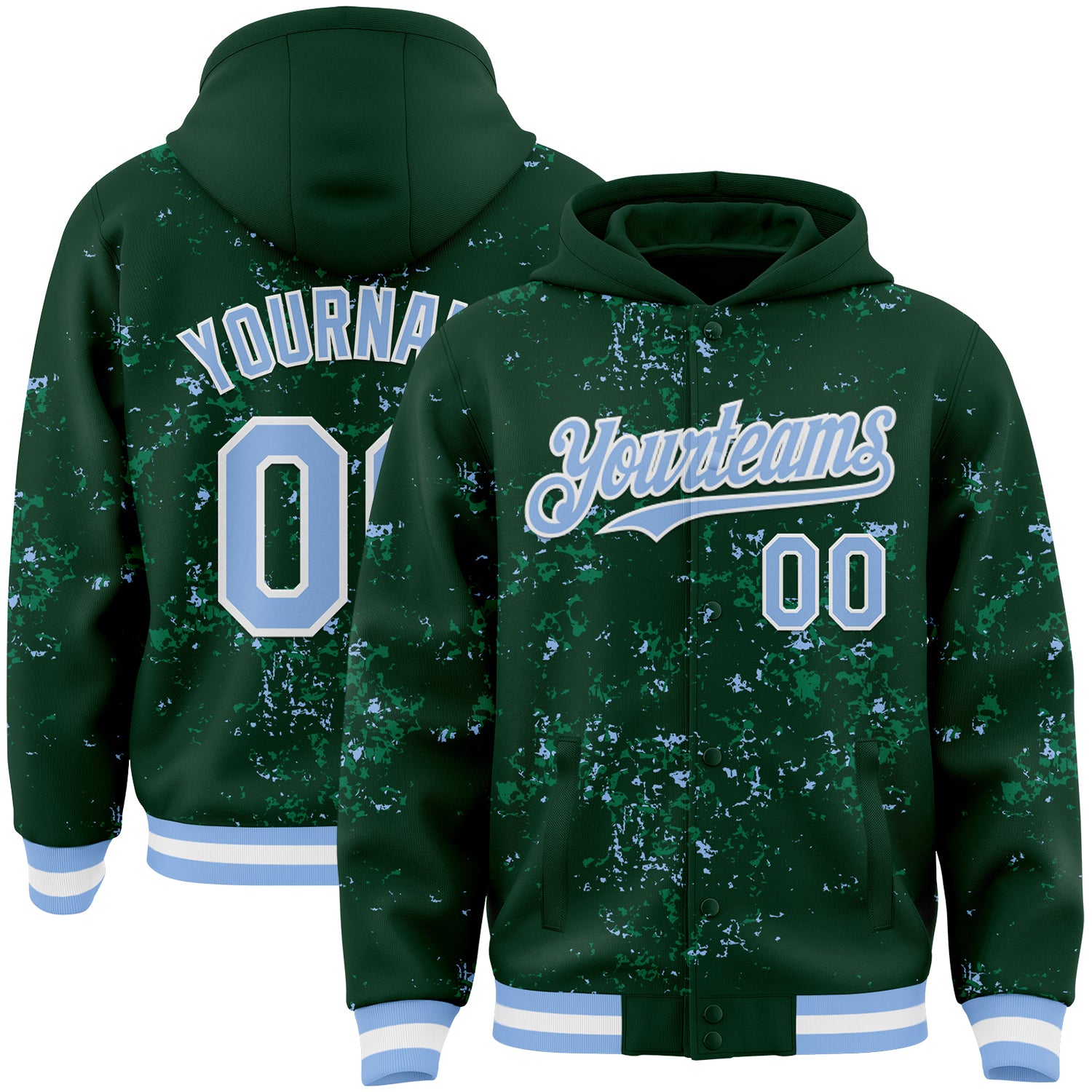 Custom Green Light Blue Kelly Green-White Fragment 3D Pattern Design Bomber Full-Snap Varsity Letterman Hoodie Jacket