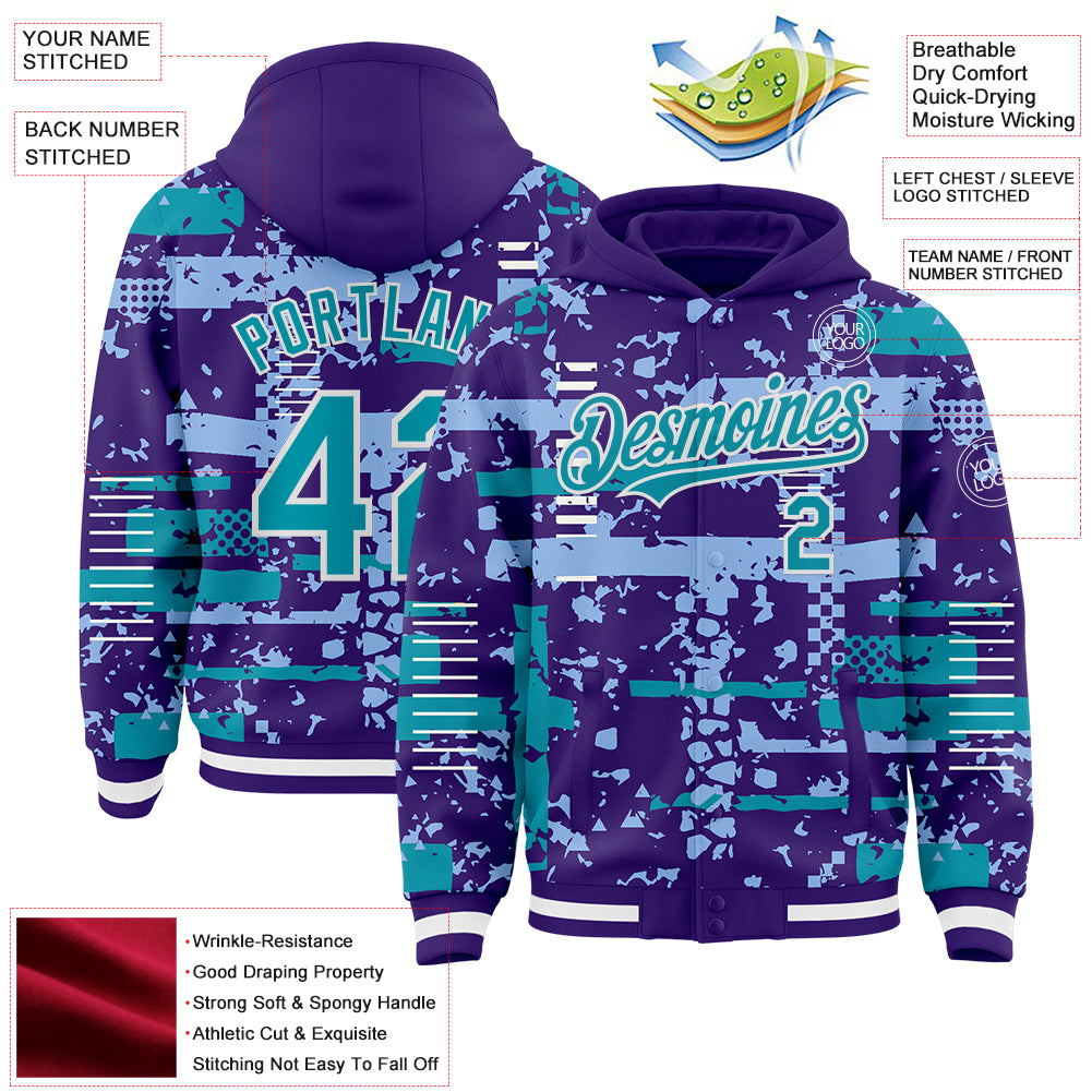 Custom Purple Teal Light Blue-White Abstract Fragment Shape 3D Pattern Design Bomber Full-Snap Varsity Letterman Hoodie Jacket