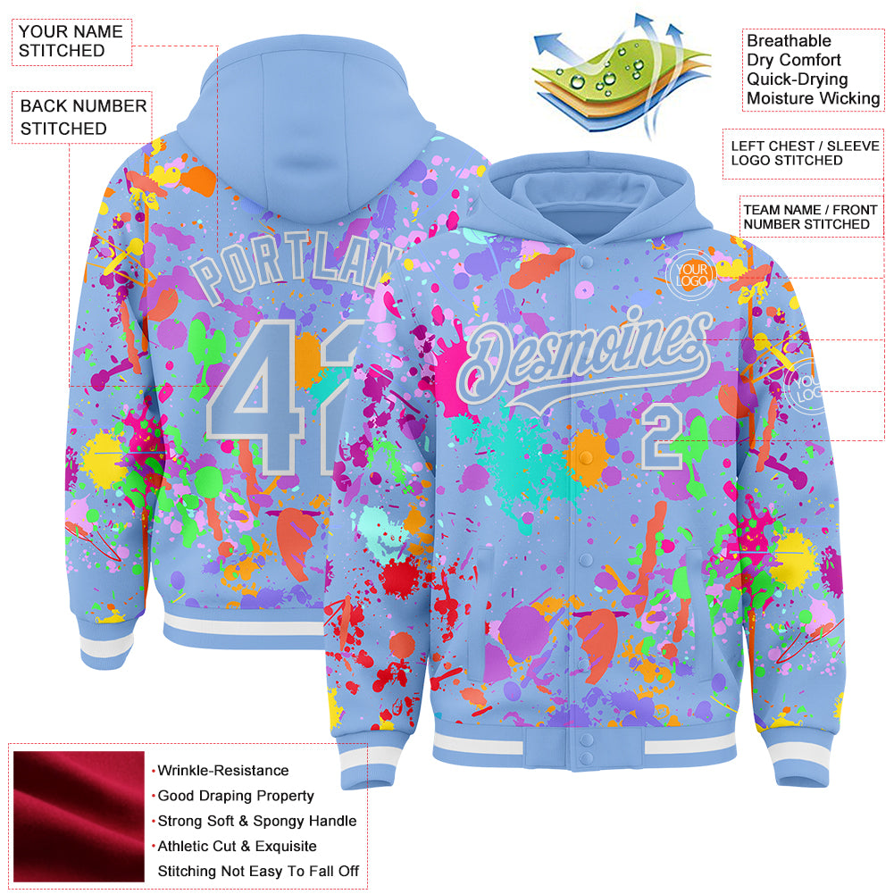 Custom Graffiti Pattern Light Blue-White Splash Bomber Full-Snap Varsity Letterman Hoodie Jacket