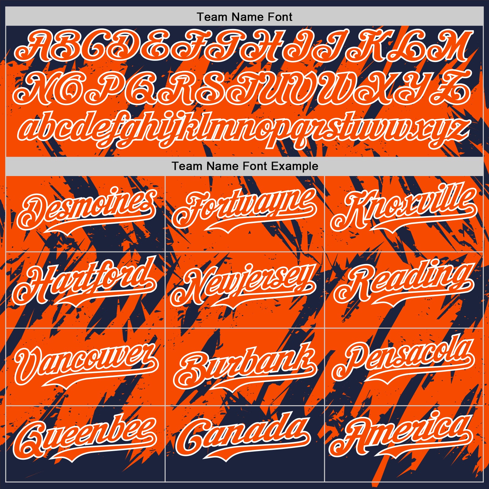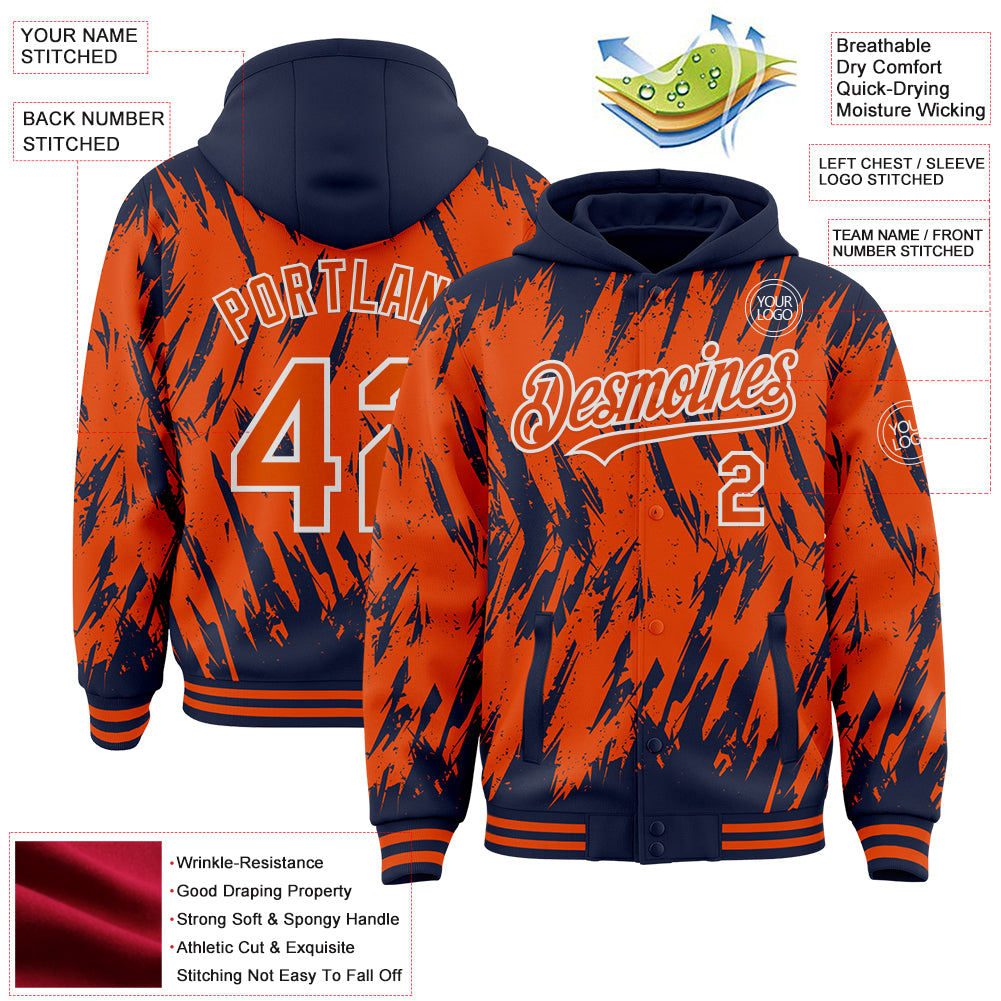 Custom Navy Orange-White Abstract Sharp Shape Fragment 3D Pattern Design Bomber Full-Snap Varsity Letterman Hoodie Jacket