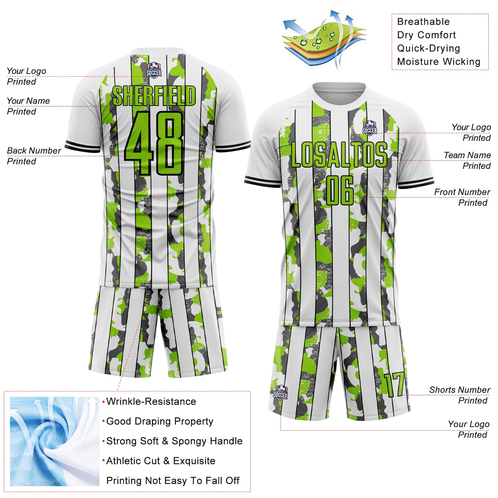 Custom White Neon Green Black-Steel Gray Camo Stripe Sports Sublimation Soccer Uniform Jersey