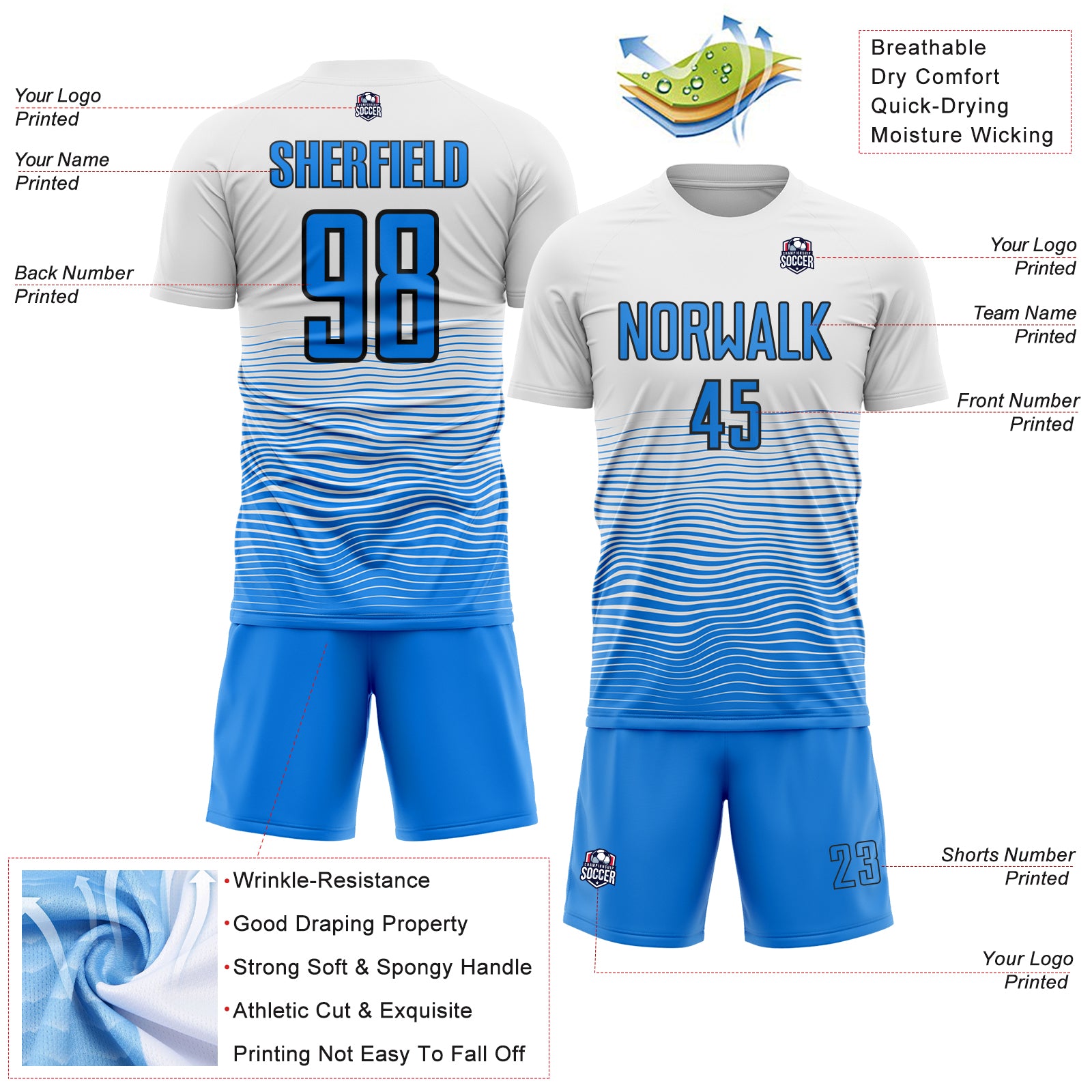 Custom White Powder Blue-Black Gradient Wave Line Sports Sublimation Soccer Uniform Jersey