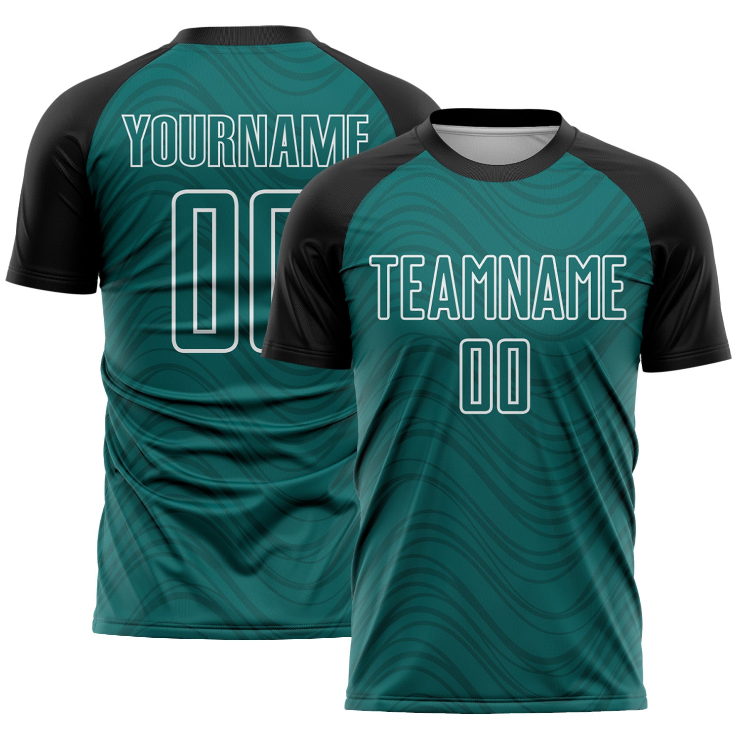 Custom Teal Black-White Wavy Lines Sports Sublimation Soccer Uniform Jersey