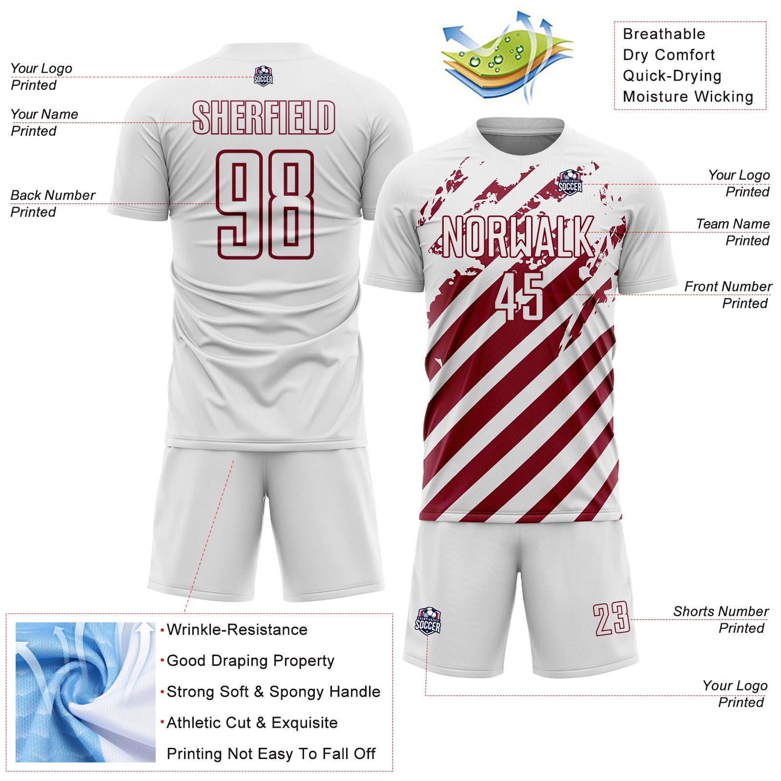 Custom White Crimson Distressed Diagonal Stripe Pattern Sports Sublimation Soccer Uniform Jersey