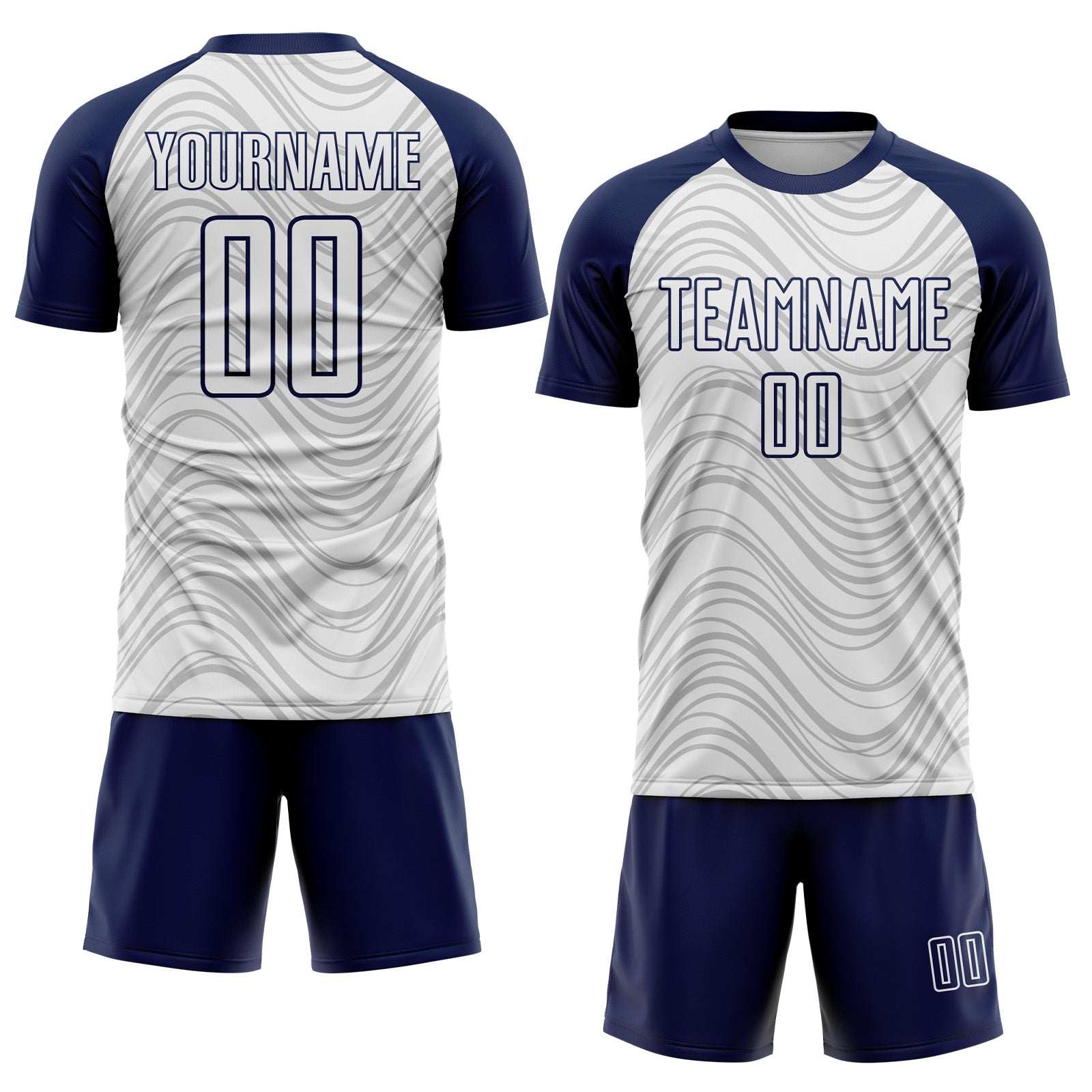Custom White Navy Wavy Lines Sports Sublimation Soccer Uniform Jersey