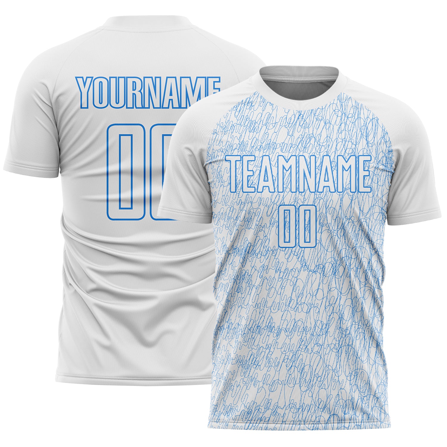 Custom White Powder Blue Abstract Scribble Curve Line Pattern Sports Sublimation Soccer Uniform Jersey