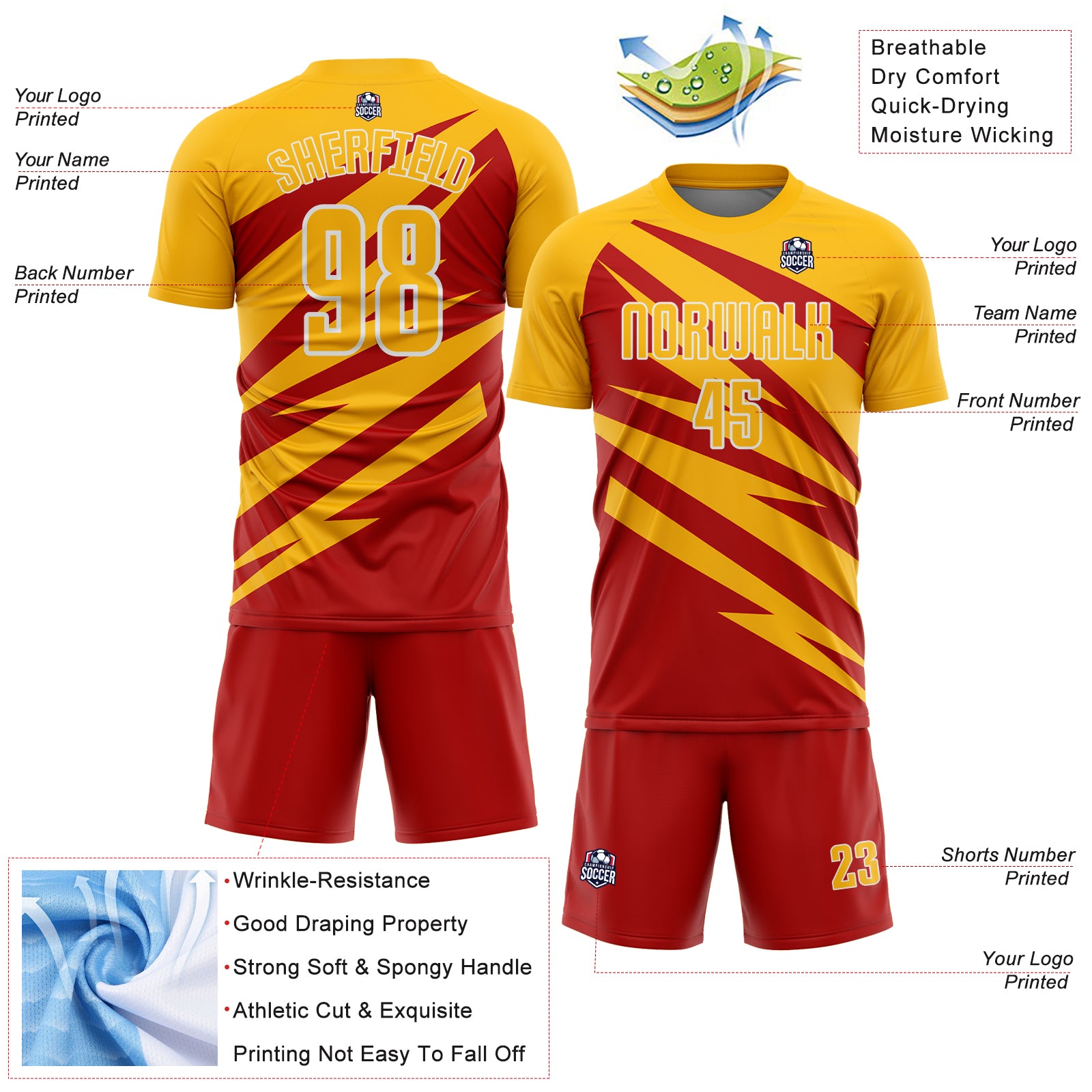 Custom Gold Red-White Abstract Line Sports Sublimation Soccer Uniform Jersey