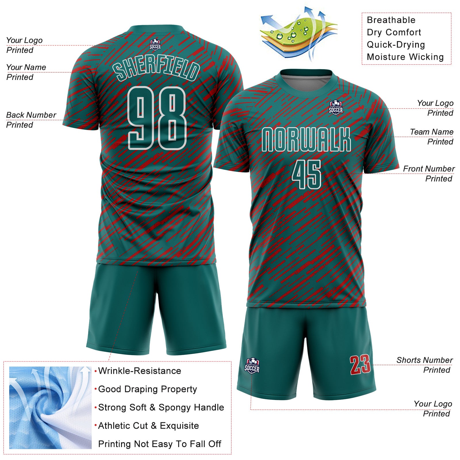 Custom Teal Red-White Line Sports Sublimation Soccer Uniform Jersey