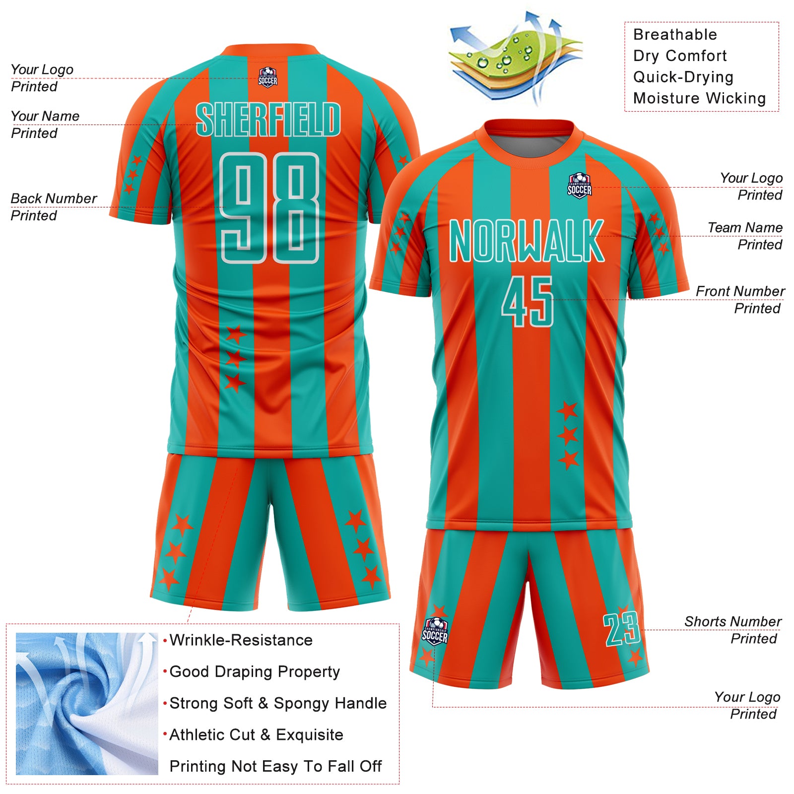 Custom Orange Aqua-White Stars And Stripes Sports Sublimation Soccer Uniform Jersey