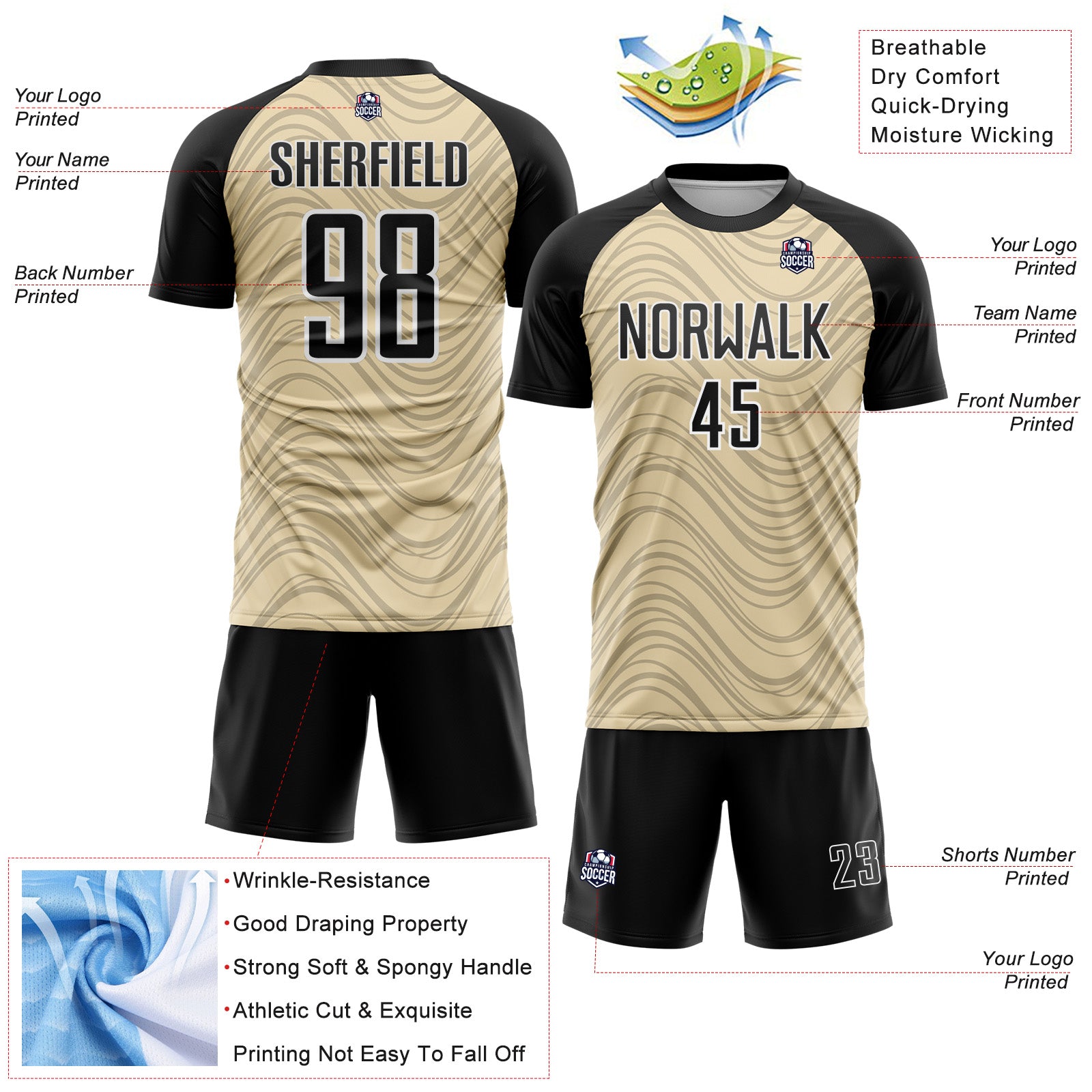 Custom Cream Black-White Wavy Lines Sports Sublimation Soccer Uniform Jersey