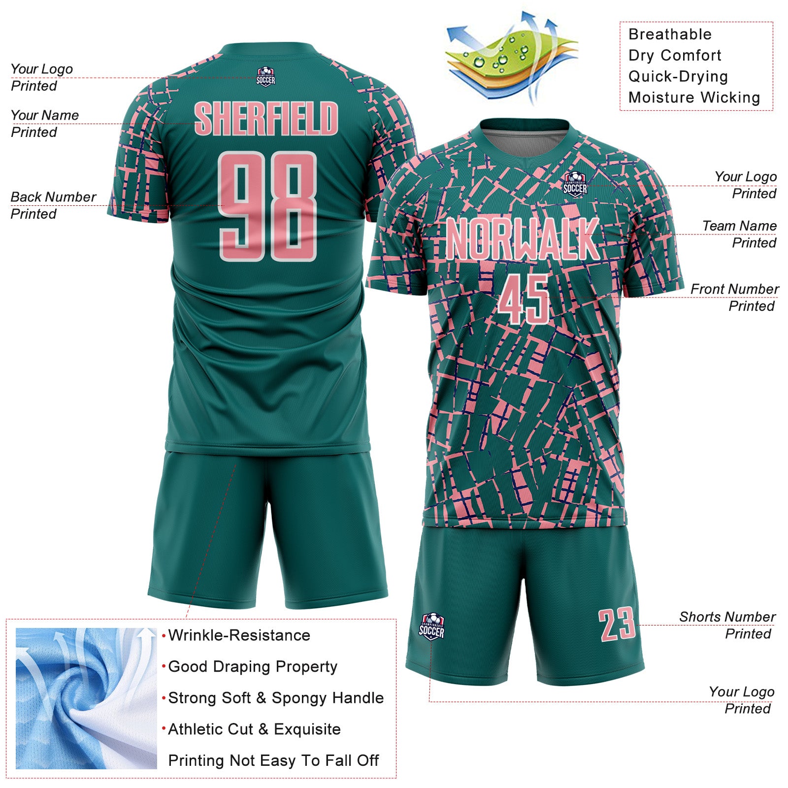 1. Material: Made from 100% polyester wicking knit with 95% polyester / 5% spandex wicking pinhole mesh