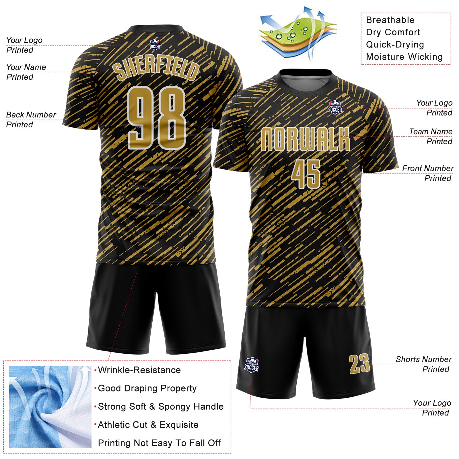 Custom Black Old Gold-White Line Sports Sublimation Soccer Uniform Jersey