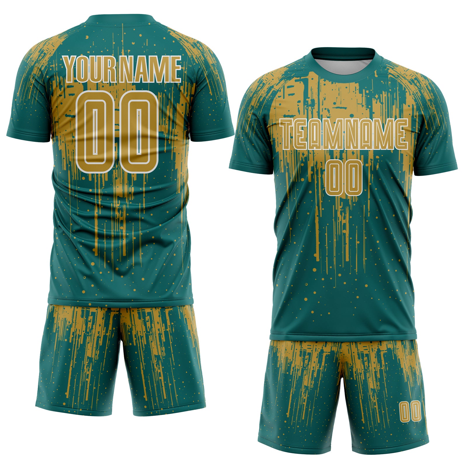 Custom Teal Old Gold-White Dripping Splatte Pattern Sports Sublimation Soccer Uniform Jersey