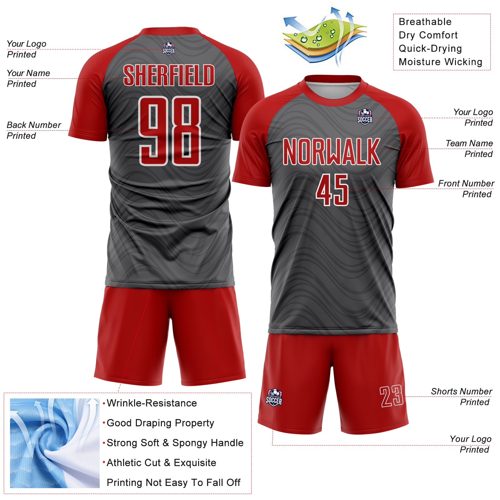 Custom Steel Gray Red-White Wavy Lines Sports Sublimation Soccer Uniform Jersey