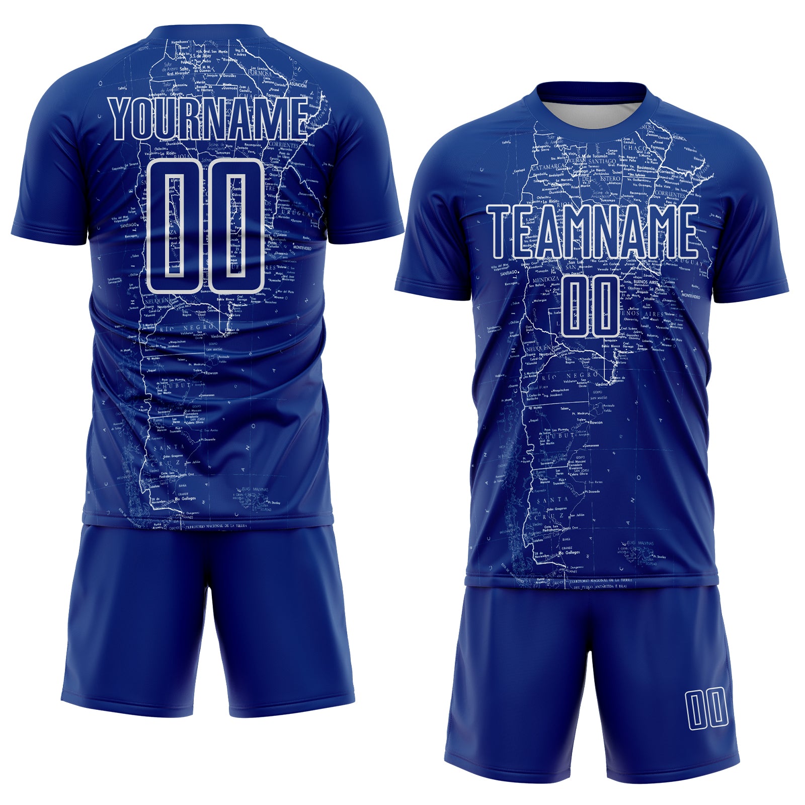Custom Royal White Map Outline Sports Sublimation Soccer Uniform Jersey