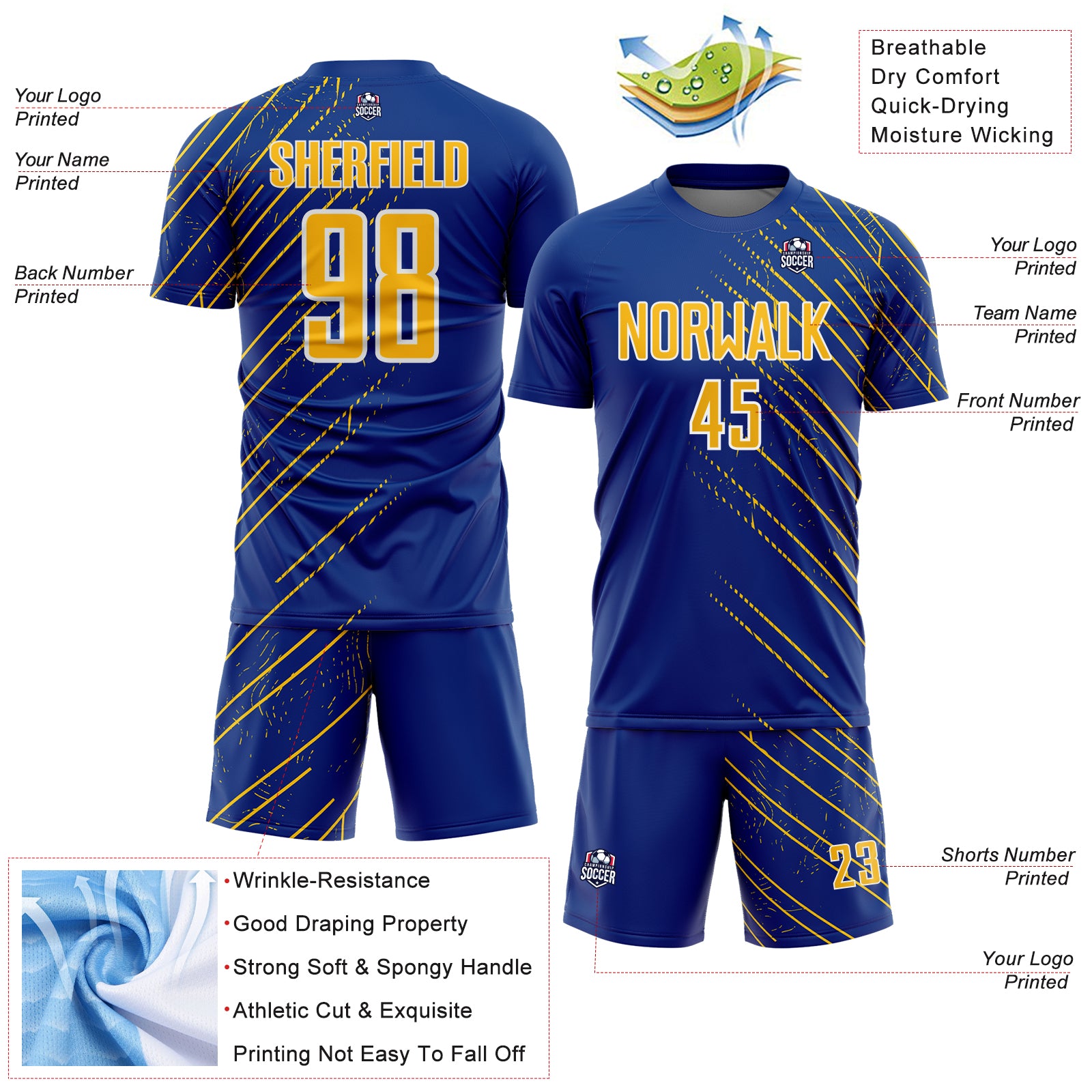 Custom Royal Yellow-White Lines Sports Sublimation Soccer Uniform Jersey