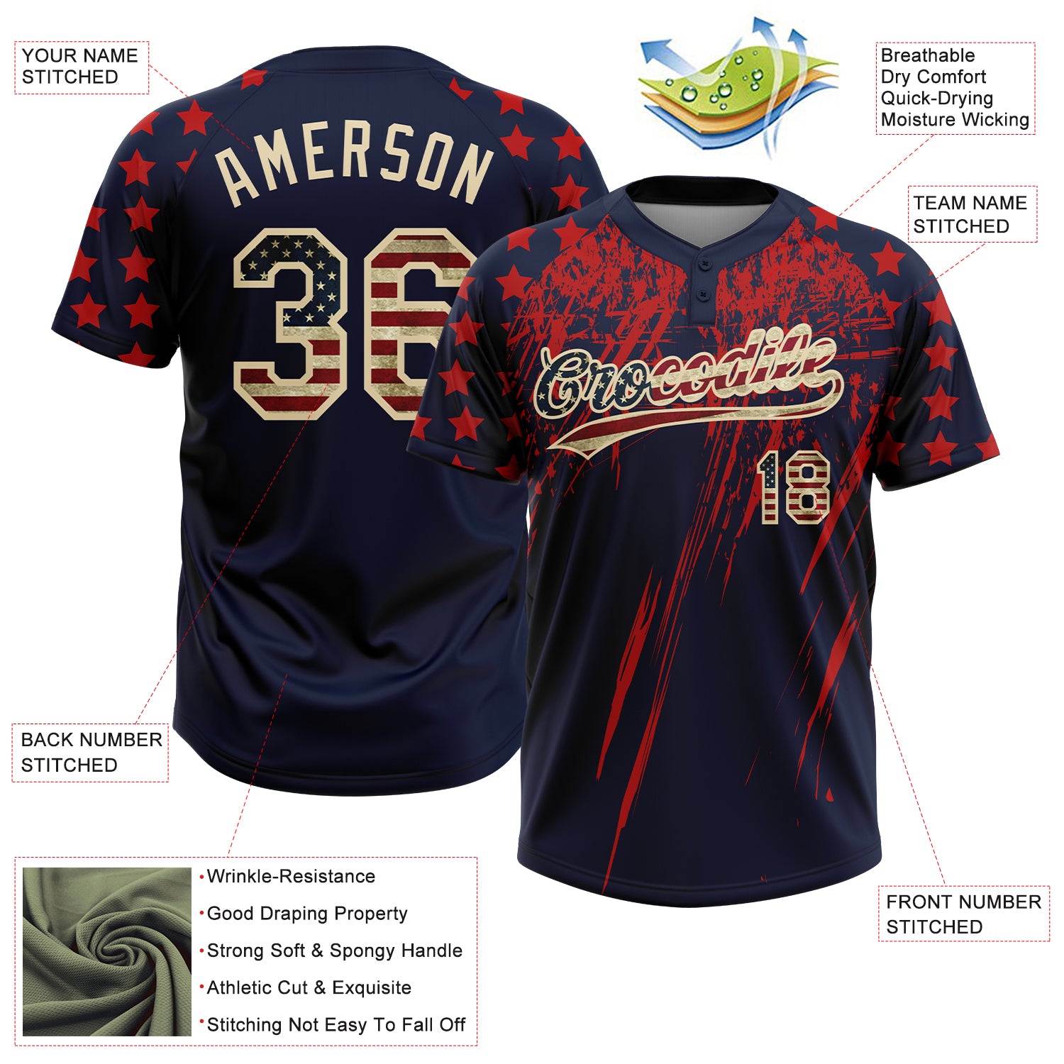 Custom Navy Vintage USA Flag Red-Cream Distressed Scratch Brush Stroke Star Raglan Sleeves Two-Button Unisex Softball Jersey