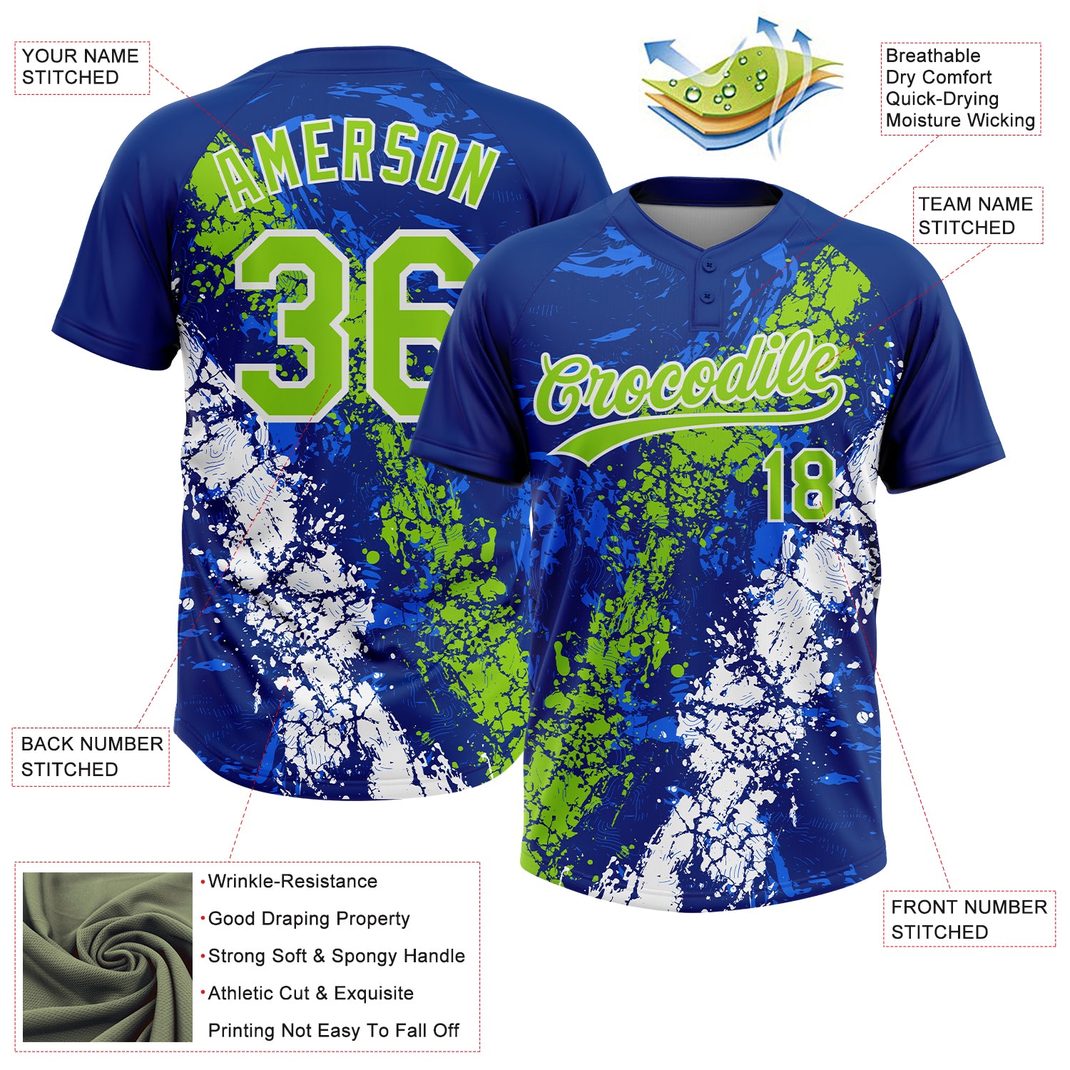 Custom Royal Neon Green-White Dripping Splatter Cracked Texture Two-Button Unisex Softball Jersey