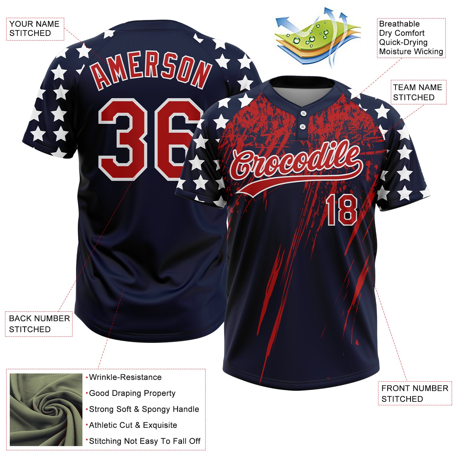 Custom Navy Red-White Distressed Scratch Brush Stroke Star Raglan Sleeves Two-Button Unisex Softball Jersey
