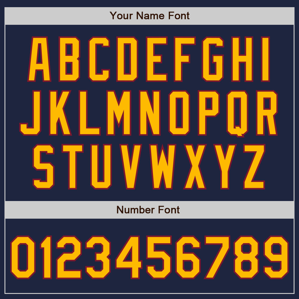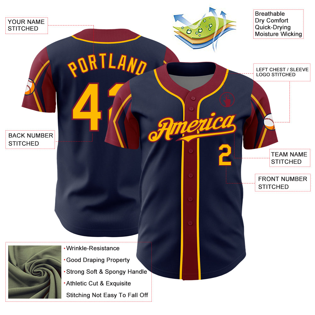 Custom Navy Gold-Crimson 3 Colors Arm Shapes Authentic Baseball Jersey