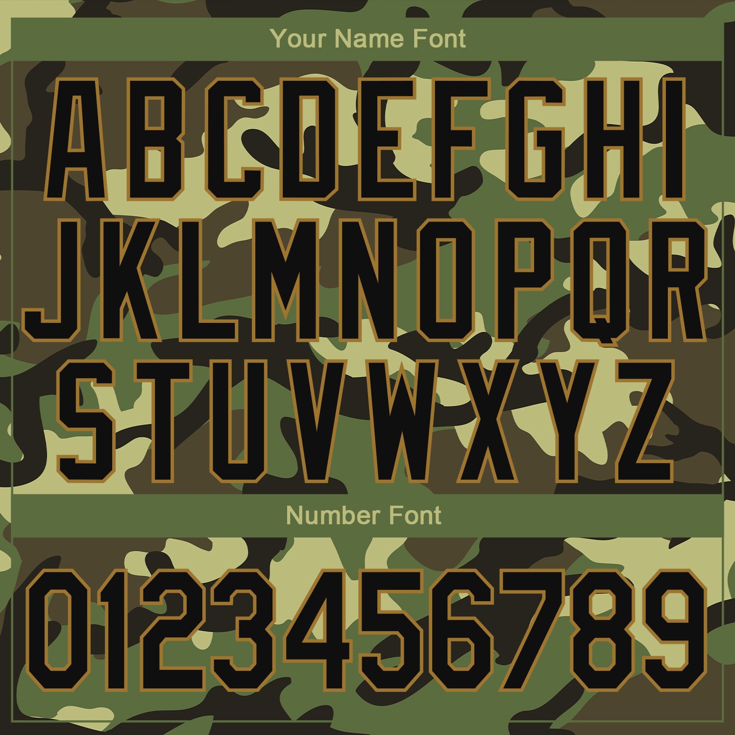 Custom Camo Black-Old Gold Jungle Camouflage 3D Bomber Full-Snap Varsity Letterman Salute To Service Jacket