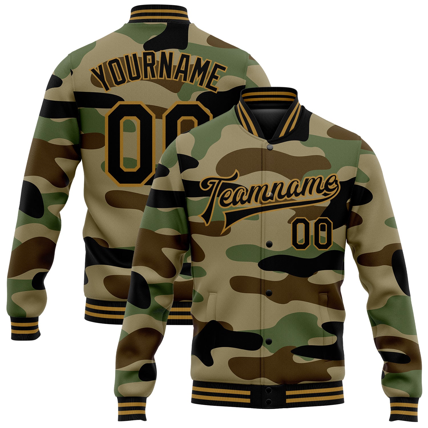 Custom Camo Black-Old Gold Jungle Camouflage 3D Bomber Full-Snap Varsity Letterman Salute To Service Jacket
