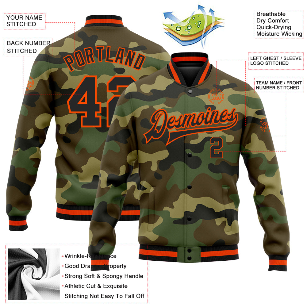 Custom Camo Black-Orange Bomber Full-Snap Varsity Letterman Salute To Service Jacket